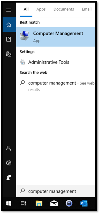 Open Computer Management on your computer. You can find Computer Management quickly by typing in “Computer Management” into the Windows OS Start Menu search bar. |