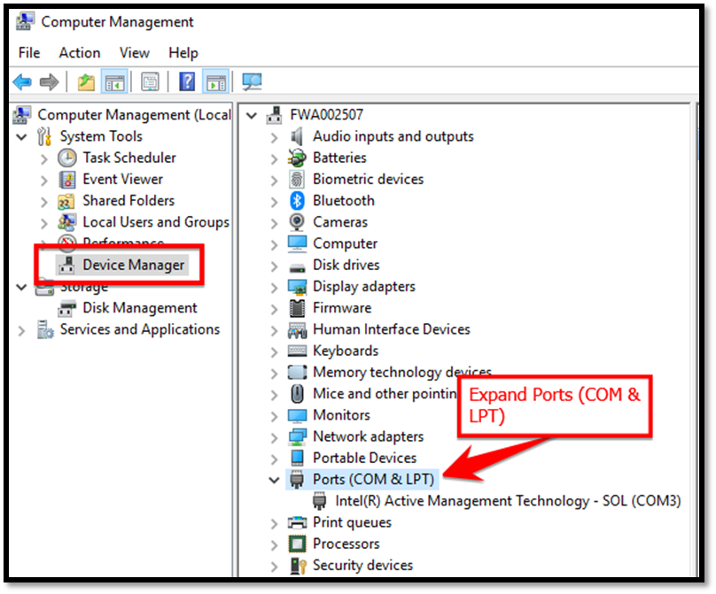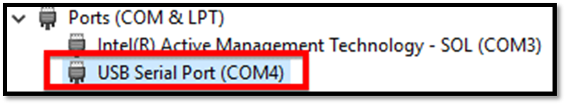Plug the Tag Sniffer tool into an available USB slot on your computer with the Ports (COM & LPT) still expanded. You will see a new COM port pop into the list. The Tag Sniffer tool in this example is displayed as USB Serial Port (COM4). Take a note of the COM # associated with your Tag Sniffer tool. |